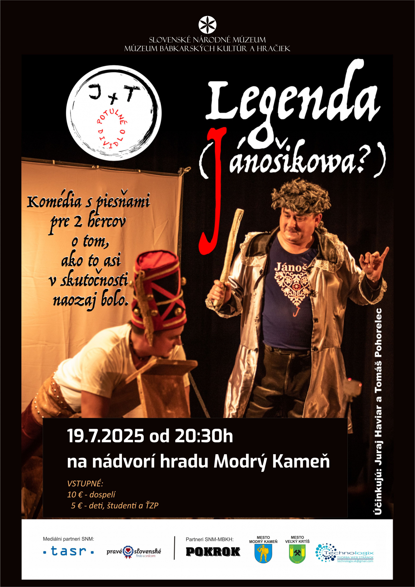 Vás pozýva na jedinečné divadelné predstavenie pod názvom “Legenda (Jánošikowa?)“, ktoré sa uskutoční na nádvorí kaštieľa na hrade Modrý Kameň. Táto špeciálna inscenácia v podaní „Potulného dividla J + T“, inšpirovaná hrou "Jánošík!" od Jozefa Mokoša, vám prinesie nezabudnuteľný zážitok spojený so živou hudbou, piesňami a silnými emóciami.